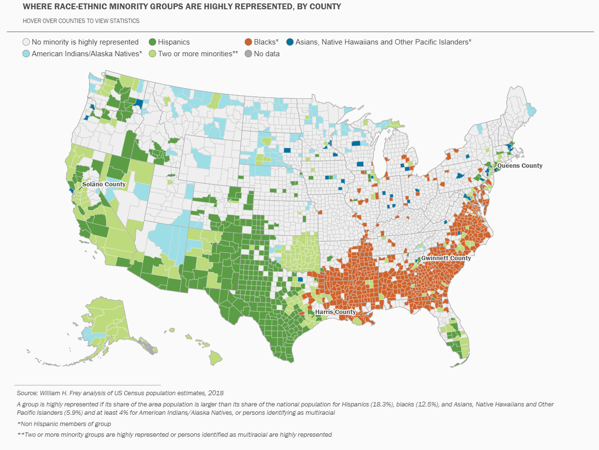 But that’s not what’s happening at all. We can also cross reference this map against a map of disproportionate racial demographics in the United States and see an almost perfect overlap. The Brookings Institute published a study, also in 2019, where they mapped disproportionate minority representation by county.