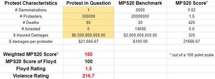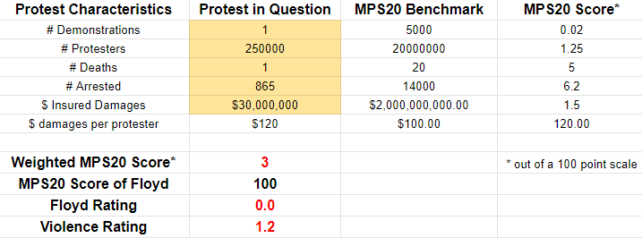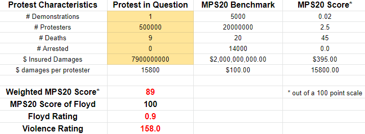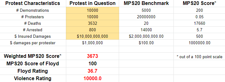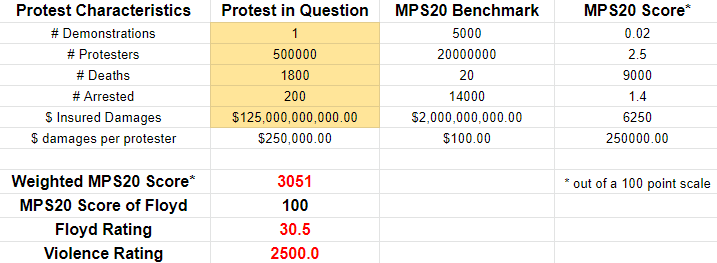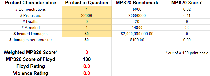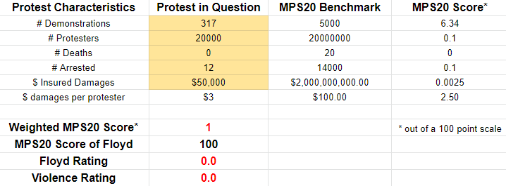 Raw statistics on the abortion protests last weekend are very difficult to come by, and the best thing I can find is this CNN article which had some anecdotes and listed some arrests. These numbers are totally made up but should be in the relative ballpark. If every city over 100,000 population had a protest, and average attendance was 500 people, this past weekend rates a 1 out of 100 on the MPS20 scale with a Floyd rating of zero. It was nothing. If you can find better numbers, collate them and plug them into the calculator to see what you get. You may get something different, but not by much.