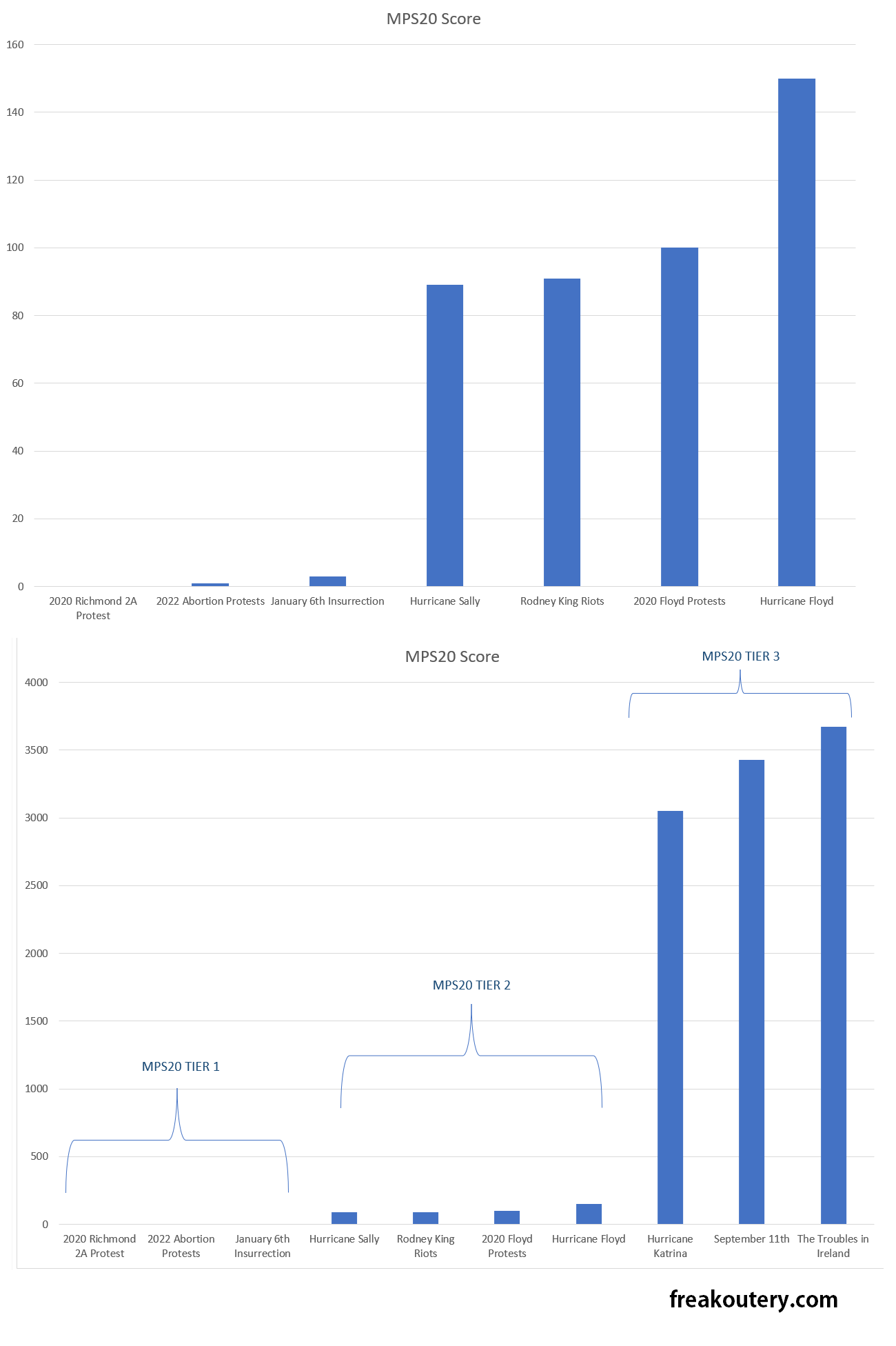 I present to you the MPS20, defined as percentage points of the severity of the protests in the summer of 2020 following Floyd, Covid-19, and the Trump reelection. Civil unrest equal to that of the Floyd-Covid protests of 2020 shall rank a 100 on the MPS20 scale, and other instances of civil unrest shall predominantly be expressed as fractions of that 100 point scale.