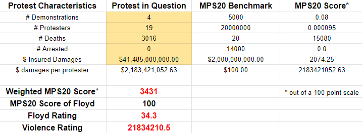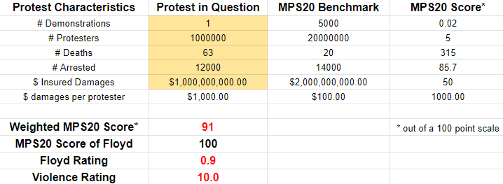 Sourced from Wikipedia, these numbers in some cases are undercounts because they are only over the central protest window, but since we’re defining a new term here we can use whatever numbers we want. In practice the Floyd protest itself may come in at over 100 on the MPS20 scale if all characteristics of the protest were fully accounted.