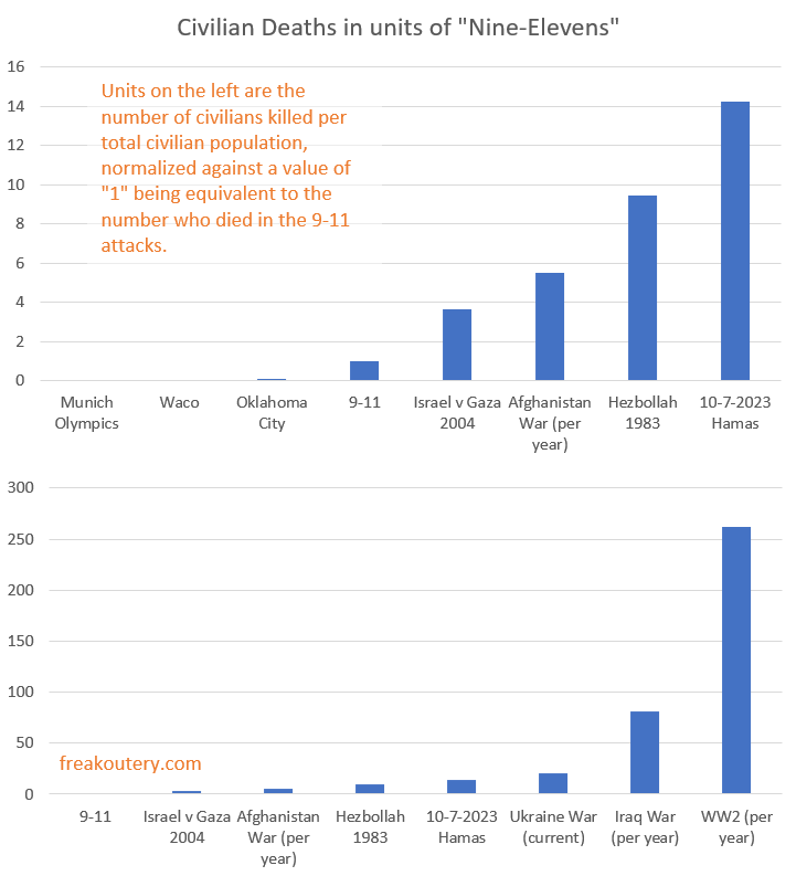 Rhetorically, if Biden wants to call the 10-7-2023 Hamas attack “Fifteen Nine Elevens,” then I have no problem with it as long as he gets the number right. But it would be disingenuous to not also mention that the January 6th “insurgency” was 0.00121 Nine-Elevens, the Israel 2004 offensive was three and a half Nine-Elevens, Afghanistan was five and a half Nine-Elevens per year for two decades, the Iraq war was 80 Nine-Elevens per year for over a half decade, and the last time we had a World War it was the equivalent of one Nine-Eleven every day and a half for six years straight.