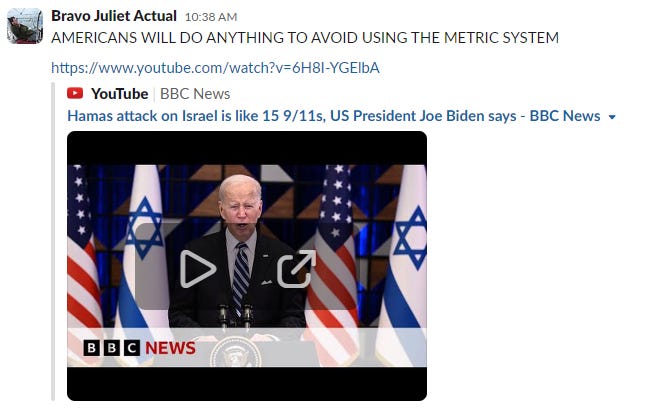 By this measure, the 10-7 Hamas offensive is equivalent to 14.2 Nine-Elevens. So Biden gets partial credit for attempting to properly compare national tragedies in an appropriate format, but marks off for not being able to do the simple arithmetic. Or perhaps we credit Biden and mark his speech writer.