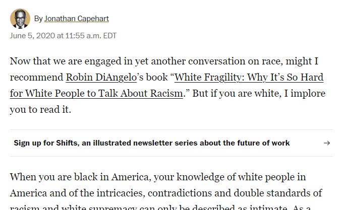 I find this take to be relatively accurate, to be honest, but there’s a very important subtext that culture war observers must remember. The Washington Post did the same thing DiAngelo and Rao did, to even greater profits.