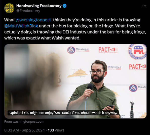 Now the Washington Post says DiAngelo, Rao, and by association the entire DEI movement is the “awful” “lunatic” “fringe,” while the worst thing they can seem to say about Walsh is that he’s a culture war profiteer. They’re not burning Walsh, but they are burning DiAngelo, and Rao, and DEI itself, and they’re doing so to protect themselves from getting burned. Which is what Walsh as a culture warrior wanted.