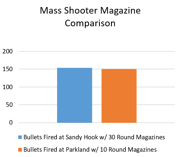 The Sandy Hook shooter fired 154 shots in five minutes. The Parkland shooter fired 150 shots in seven minutes. Neither shooter engaged another armed opponent, where reload times would have mattered. Either shooting could have transpired just as easily with a 10 round magazine as a 30 round magazine. The limitation on both instances was not fire rate, nor reload time, nor in fact range. The limitation was how many rounds the shooter could fit in their school backpack.
