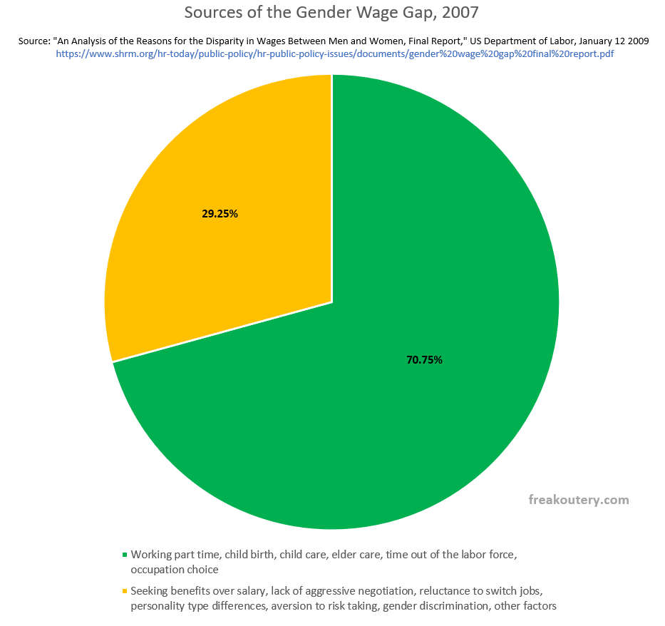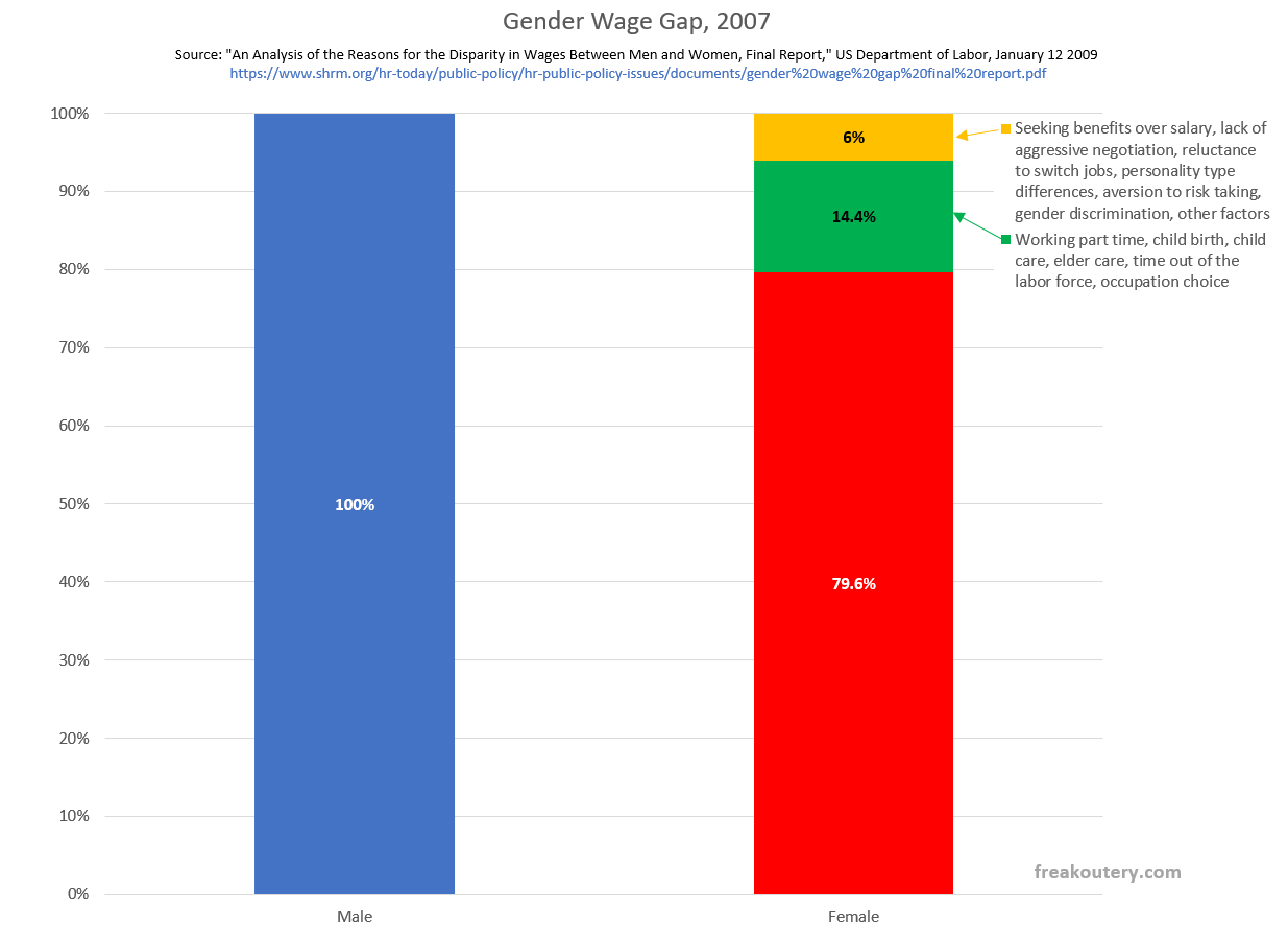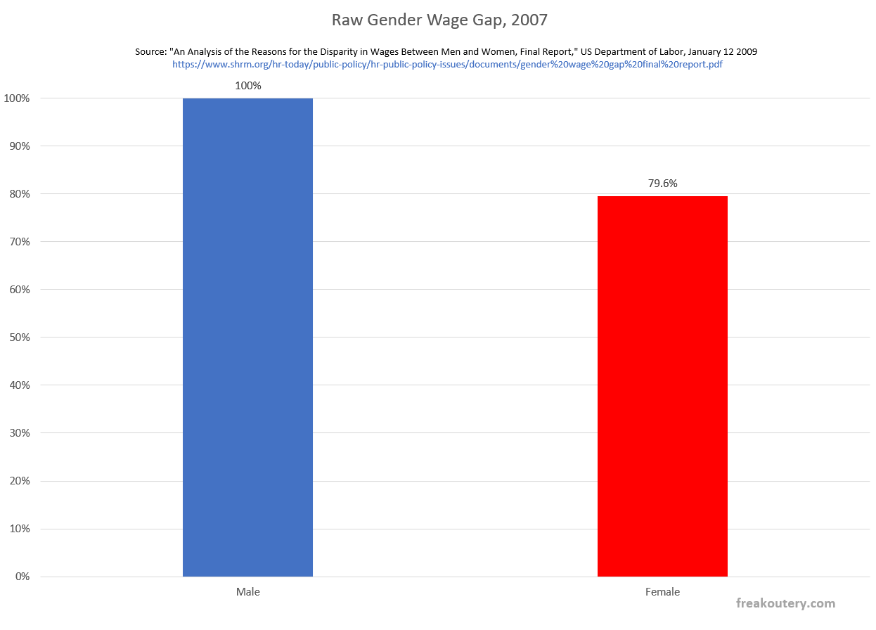 HWFO covered the gender wage gap in 2022, but I’ll summarize it here so you don’t have to read back. According to a 2008 analysis by the Department of Labor, now 16 years old, the raw gender wage gap was 20.4% in 2007: