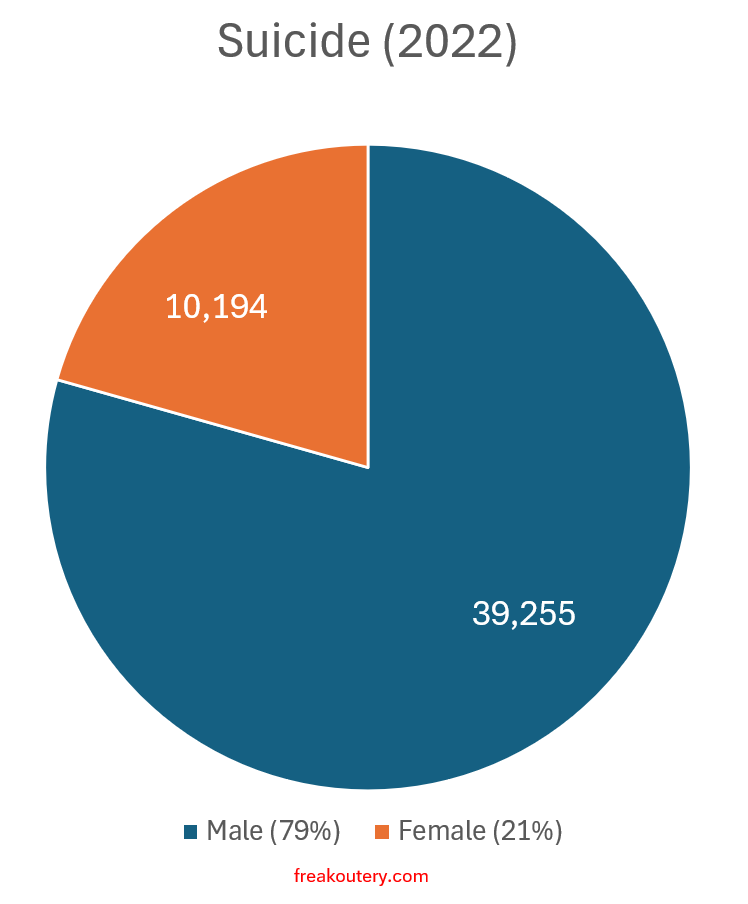 The act of giving up on your own life so thoroughly and resolutely that you choose to end it is a horrible act, but also may be a reasonable bellwether about the relative privilege of the genders. Like in the case of homelessness above, this is at least in part a measure of the relative hopelessness or despair of a portion of the population. In the USA in 2022, 79% of suicides were by men.