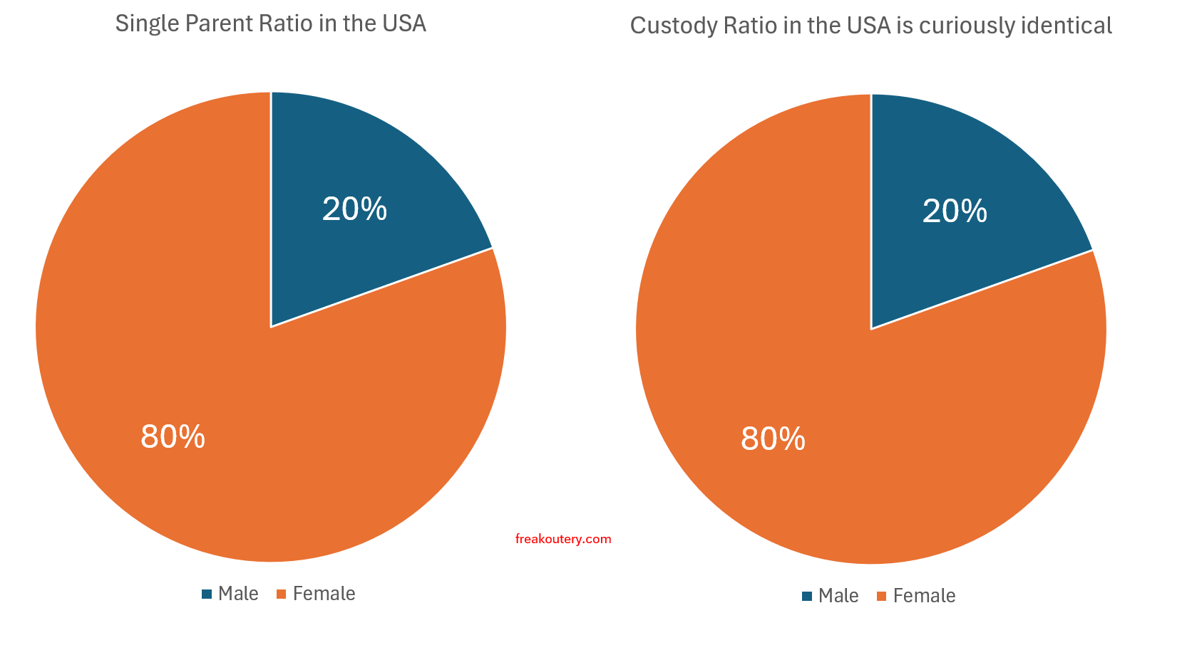 Out of the eleven million single parent homes in 2020, 80% were headed by single mothers. Some of this flows from unwed mothers with absent fathers, but exactly the same number (80%) of divorce custody cases end with the mother being granted custody, while in only 52% of cases was this arrangement agreed upon by both parties. Two thirds of divorces involving children are initiated by women. One in five divorced mothers have sole custody with zero visitation allowed by the father. Father income and access to better legal representation has no effect on the outcome of custody battles. I do not know if 80% is some magic number or merely a curious coincidence.