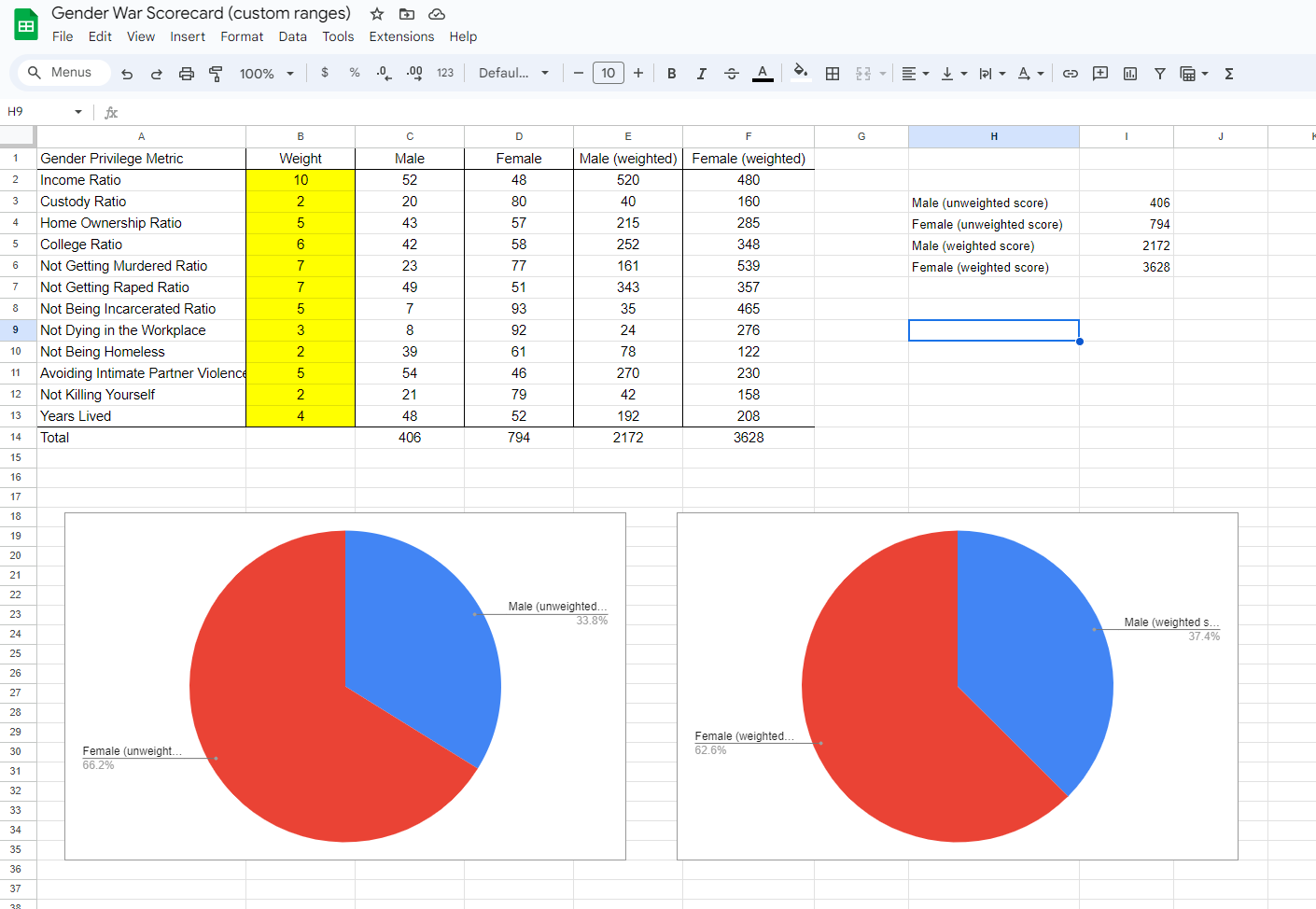 If we were to take each of these measurable socioeconomic factors as equal weight, then women score a 66 to the men’s 34, meaning women are currently around twice as privileged as males are in the USA, numerically speaking. This is a blowout win. But that might not be fair, because income ratio or college attendance might be more important than suicide or dying in the workplace, so if you wanted to weigh each of them and generate a modified scoreboard, I built you a google sheet to do so. It looks like this: (change the yellow boxes, leave the rest alone)