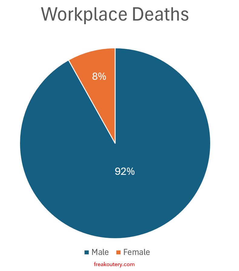 In 2022, the Bureau of Labor and Statistics indicated that the USA had 5,486 workplace deaths. 445 (8%) of these were women, and 5,041 of these (92%) were men.