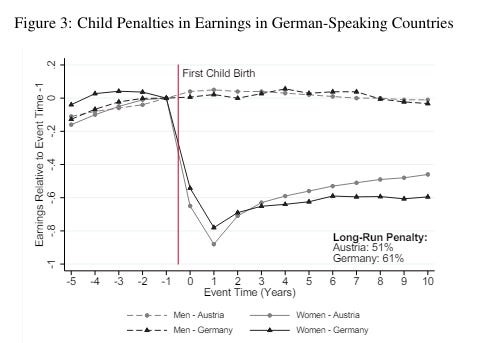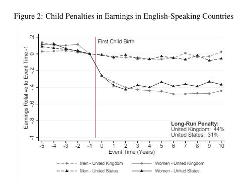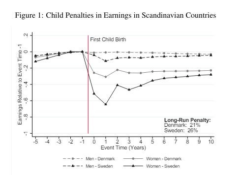 Sixteen years ago, the bits of the gender wage gap that weren’t explained by career and life choice differences only totaled 6%. This fact has been known for a decade and a half and is constantly hidden from view by Pew, the NLWC, and any other major organization that profits from the perception that this gap is large and persistent. It has also assuredly closed to narrower than that 6% in the ensuing decade and a half, but nobody’s replicated the Department of Labor analysis. Look closely at the effects in the green bar identified by the Department of Labor. “Child birth” is how you become a mother. “Child care” is something mothers do. “Working part time” is something mothers do. “Time out of the labor force” is something mothers take. “Occupational choice” is something women change when they become mothers. Here are some graphs from Kleven et al, March 2019: