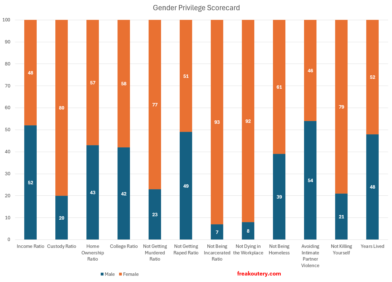 Farming all of the data above, we can generate a kind of a scoreboard to see how each gender is doing in its war for societal advantages against the other. When we do so, with each category normalized on a 1-100 style percentage scale, the compiled results look like this: