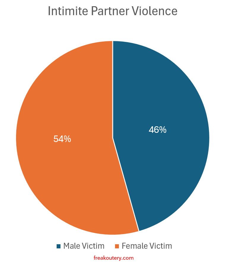 According to their statistics, 22% of all individuals will report being assaulted by an intimate partner at least once in their lifetime - 23% for females and 19.3% for males. This means that among all victims, 54% are female and 46% are male. We probably don’t hear about this because of the modern media clickbait engine. Women click and share on articles, stories, and statistics that show them as victims, and men actively avoid clicking on articles, stories, and statistics that show them as victims. This, combined with the majority of the media being liberal-centered and encouraged to advance a certain narrative when it comes to feminism prevents this fact from being widely shared.