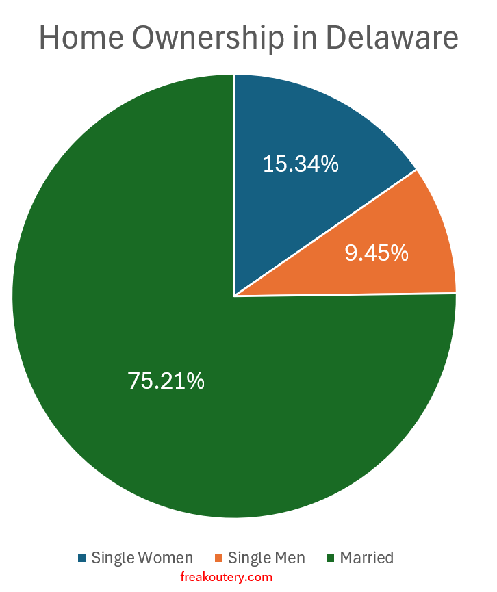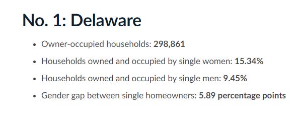 In the Lending Tree analysis, the state with the highest ownership share of single men is New Mexico, which still more single women home owners. Only three of the fifty states have a gap favoring men, Alaska, North Dakota, and South Dakota. Basically the three places you’re most likely to find some dude trying to be a hermit, or least likely to find a single mom needing a public school system. By national averages, the single homeowner ratio is 57:43 in favor of the women.