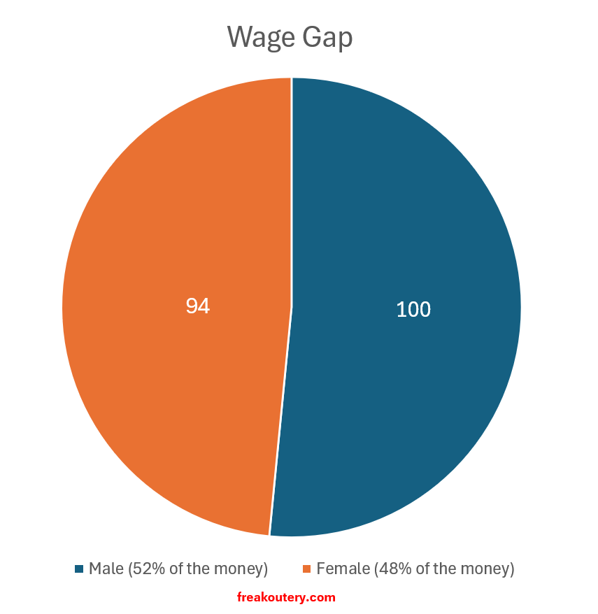 For our comparison today, we’ll stick with the Department of Labor analysis that showed female salaries, adjusted for motherhood choice and choice of profession, are 94% of male ones. 52% of the money earned is earned by males, 48% is earned by females.
