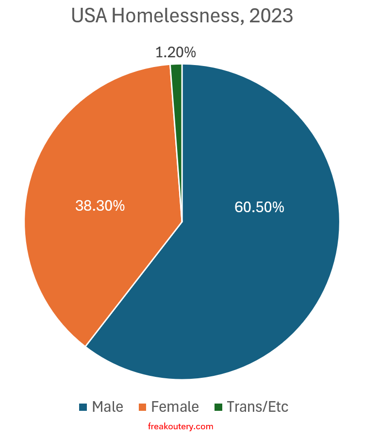 In 2023, the Department of Housing and Urban Development counted 653,104 homeless Americans in its annual point-in-time report, 60.5% were male, 38.3% were female, and 1.2% were trans or another category that didn’t fit into the gender binary.