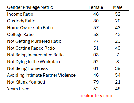 Herein we will go point by point through as many measurable societal markers as I can think of, leaving no marker unmarked, and put together a Gender War Scoreboard describing as accurate a snapshot as possible of the current state of the United States. Then we’ll close with some analysis about how badly it would have to get before the women finally just declare victory and move on. This post shall be too big for email.