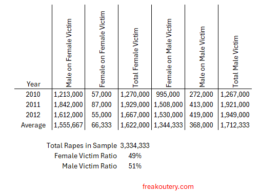 To assign our score, we will look at sets of data that fall generally into two categories. For victimization ratios and similar, we’ll just look at percentage by gender. For comparing two uncapped sets of data, such as life expectancy, we’ll look at a ratio and make them both add to 100 for an apples-to-apples comparison. Then we’ll add them all up at the end to tally the score.
