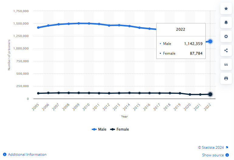 It seems to be true that men commit more crimes. It is well documented that women can get out of small infractions and citations by using their feminine wilds on the cop, but that probably doesn’t come into play with incarceration-level infractions. It is well documented that women receive substantially smaller sentences for the same crimes as men. These three factors combine in some way to produce the results we see in the graph above. Out of a total 2022 sample set of 1,230,143 incarcerated individuals in the United States, 93% were men and 7% were women.