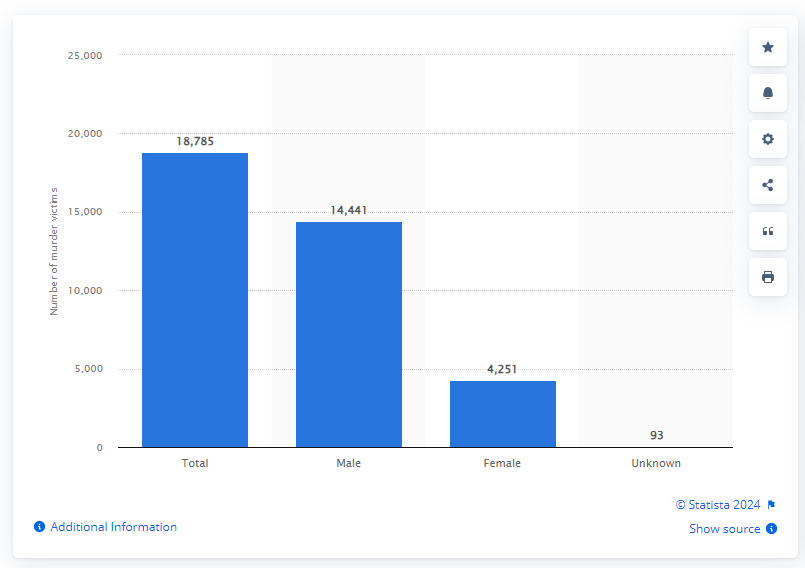Stripping out the “unknowns” from Statista’s graph above, by 2022 numbers 77% of murder victims were men, compared to 23% women. A 77:23 advantage to the women in not getting murdered.