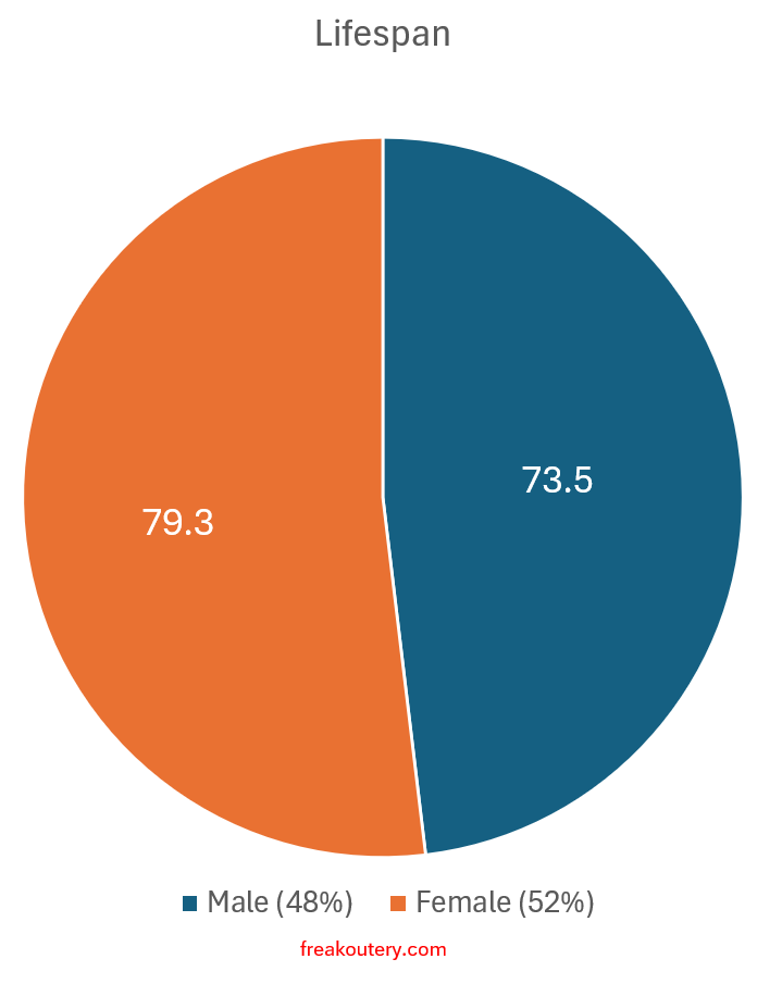 As of 2021, life expectancy among United States men was 73.5 years, compared to 79.3 years for women. If we try and set this up like a scorecard, women live 52% of the years lived, while men live 48%.