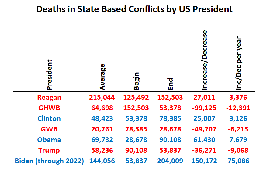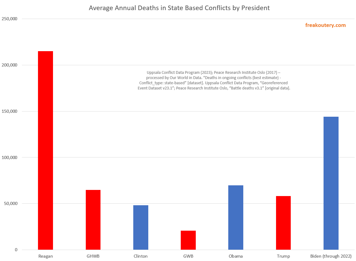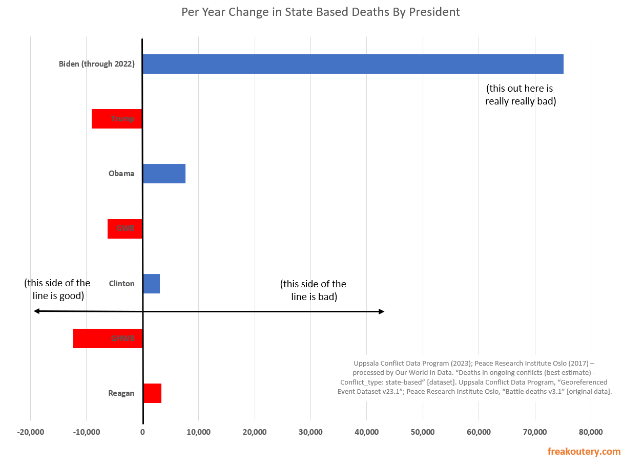 The cold war had a lot of deaths in state based conflicts around the world, Bush One presided over the collapse of the cold war and banked the losses, Clinton got a little bit better, Bush Two surprisingly oversaw the most peaceful time in the world by measure of overall global conflict, Obama more than tripled GWB’s numbers, Trump reigned Obama’s numbers in some, and under Biden we’re on track to reach levels of conflict not seen since The A-Team was on TV. The differentials are very extremely astoundingly bad.