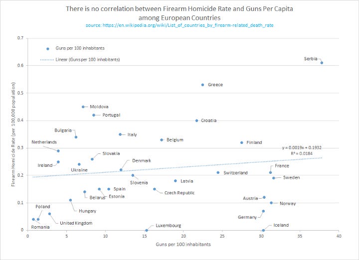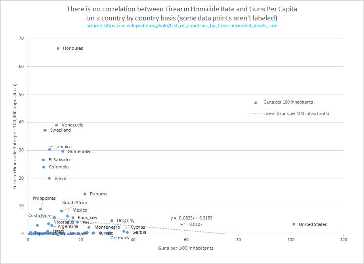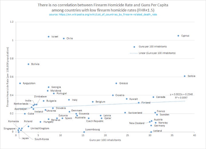 Then he went on to share the rest of the graphs from the article, such as this one which shows no bivariate correlation among low-homicide countries.