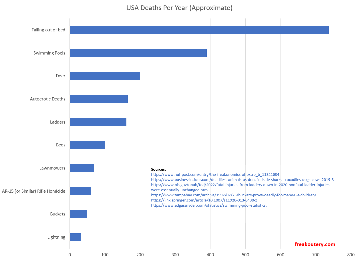 “Deaths by assault rifle” in the United States are so exceedingly rare they’re fewer than deaths by lawnmower or deaths by bees, and only barely more than deaths by buckets, even with tens of millions of semiautomatic rifles in circulation.