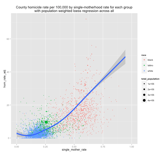 The homicide rate racial divide remains when plotted against wealth inequality, education level, housing security, and every other socioeconomic factor except one. One factor seems to be more directly explanatory than all others: fatherlessness rate. If you want to address the murder rate in the black community to bring it down to the rates we see in peer nations, or other racial categories domestically, the data shows we must somehow address black fatherlessness rate.