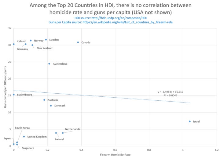 …in which we also calculated it for top twenty Human Development Index countries other than the USA, which also shows no bivariate correlation. USA is the outlier.