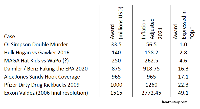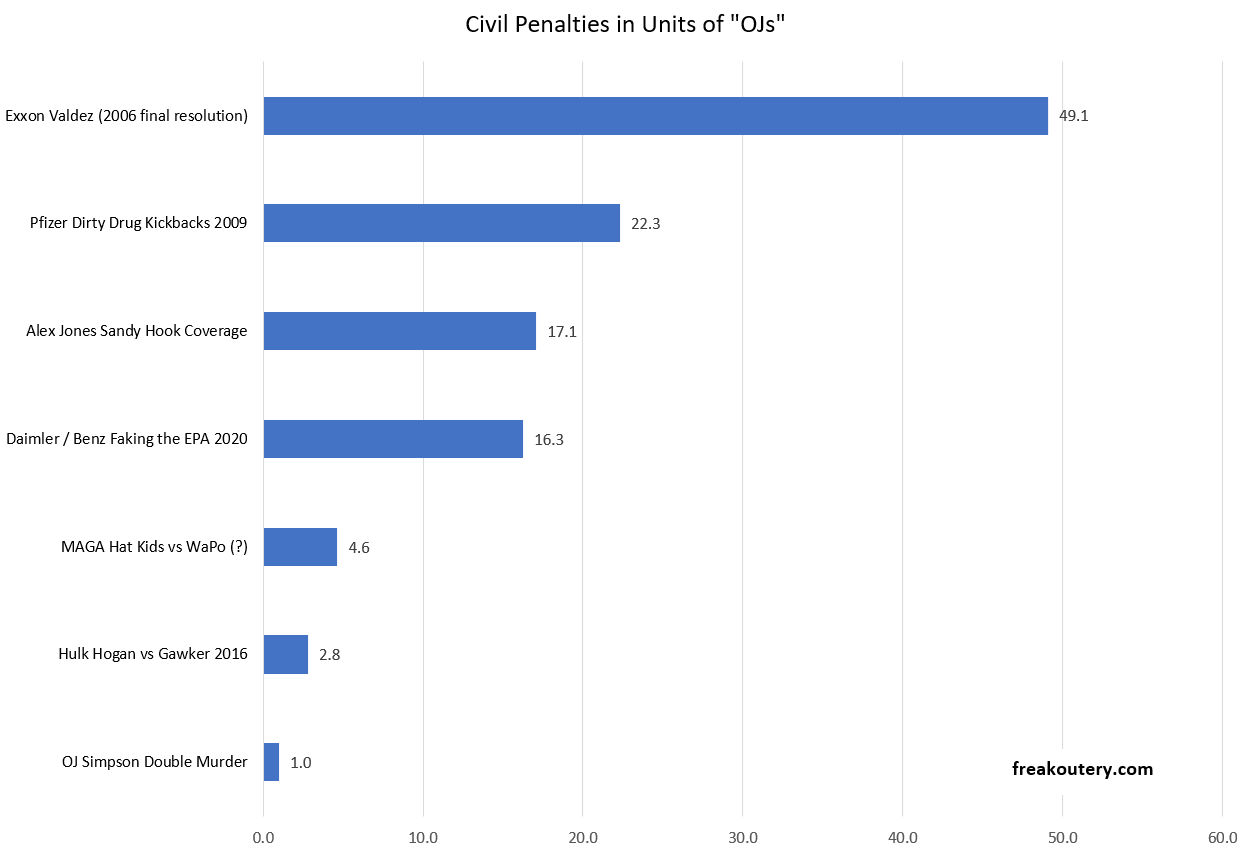 This shall be our benchmark unit. The civil award for the trial of the century involving a double homicide by a famous sports celebrity is 56.5 million dollars inflation adjusted to 2021 money, or “One OJ.”