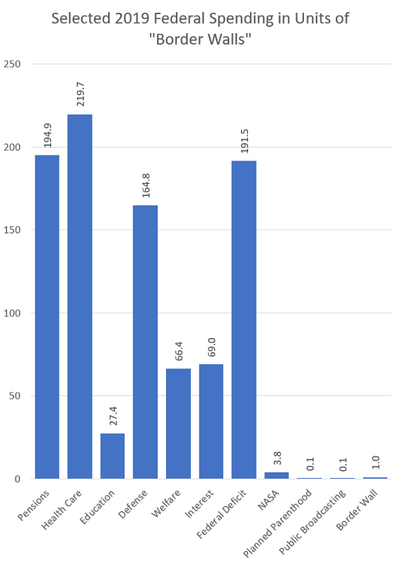 We have spoken at length on HWFO about the human mind’s inability to comprehend large numbers, and how to ameliorate that by using different units. A billion is a thousand millions, but when we read or hear “billion” it’s just a swap of a letter, so we don’t understand it. Even a thousand of something is hard to visualize. To do this properly, we need to compare large numbers against other large numbers, so we can establish an appropriate perspective. We did this once with the government, by comparing the federal outlays for different programs against the envisioned cost of Trump’s proposed “border wall.”