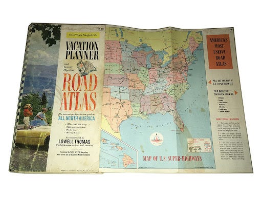 When I was a kid, every new driver learned how to use a road atlas. Kids These Days (get off my lawn!) have never even seen a road atlas, but they were essential for life in the 1990s and prior. They look like this.