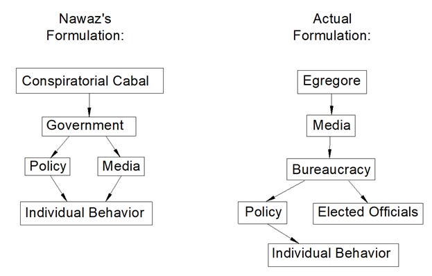In Nawaz’s formulation, a conspiratorial cabal influences government, the government influences both policy and the media, and then policy and the media influences individual behavior (such as masks). This is wrong, because the low and mid-level clock punchers are not beholden to the cabal. They are beholden to their smartphones. And their smartphones are beholden to the media, which in turn are beholden to the pay per click traffic incentive, which is derived by feeding an echo chamber what it wants to hear. The groupthink entity at the bottom of the echo chamber is the actual power. The egregore.