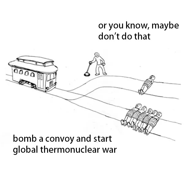 I don't think your trolley problem is representing the situation correctly. If we're assuming "rational decisionmaking" for one side, we should do so for the other. _Why_ is bombing a convoy directly causing a thermonuclear war? Other side needs to act. Why would it be sensible for them?