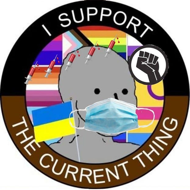People captured by an egregore must signal to their peers that they are as or more virtuous than their peers within the egregorical framework. That is how they accumulate status within the egregore, as they seek to become a more central node within its hive brain. “I Support” Circles around Facebook photos, symbols following Twitter handles, and such, are symbols of an active egregore. In 2020 we had “leaving home is murder” virtue signals pivot in the span of a day to “not leaving home is racist” signals, back to “vaccines save lives” signals. But as the Covid narrative has completely fallen apart the virtue climbers need some other signal, and they latched onto Ukraine. The number of people who were pro-mask, pro-vax, pro-lockdown, and who are not currently pro-Ukraine in a geopolitical conflict that does not involve NATO, does not involve the USA, and has nothing to do with our national security, is effectively zero. This is a sign that that egregore has abandoned Covid and adopted Ukraine as a way to perpetuate itself. It jumped topics, abandoning the sinking ship of germs and moved onto the fresh topic of the new war. The Covid NPCs now wave Ukraine flags to virtue climb and scrub their minds of any inconvenient memories of their now embarrassing Covid behavior.