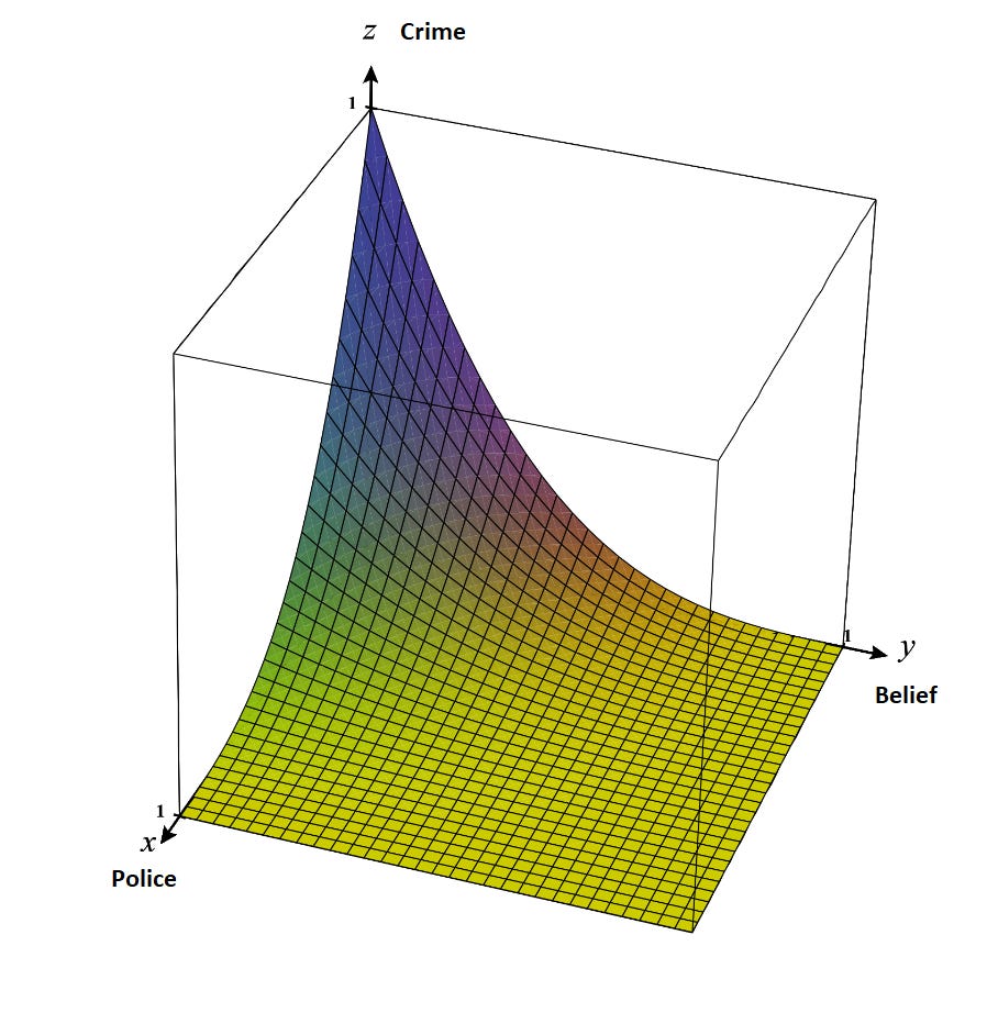 I can hear you through the monitor. One of you is screaming “your hypotheticals are trash because there is no such thing as a perfectly adopted belief system or a perfectly adopted police state.” Another of you is screaming “but what happens when someone tests the boundaries of belief and discovers that the chainsaw dogs are broken or the tooth fairy doesn’t exist?” I yield to these legitimate criticisms, as the hypotheticals were obviously absolutes. The first hypothetical is an absolute police state, the second and third are absolute belief states. In practice, crime is in part a function of how many “police” a culture has, and how much “belief in enforcement” the culture has. The two form a function, where 100% policing yields no crime, 100% belief in enforcement yields no crime, less than 100% of both yields some crime, and 0% of either gets you a shit pile of crime. The function might look something like this, with the graph peaking where all potential criminals are committing crime: