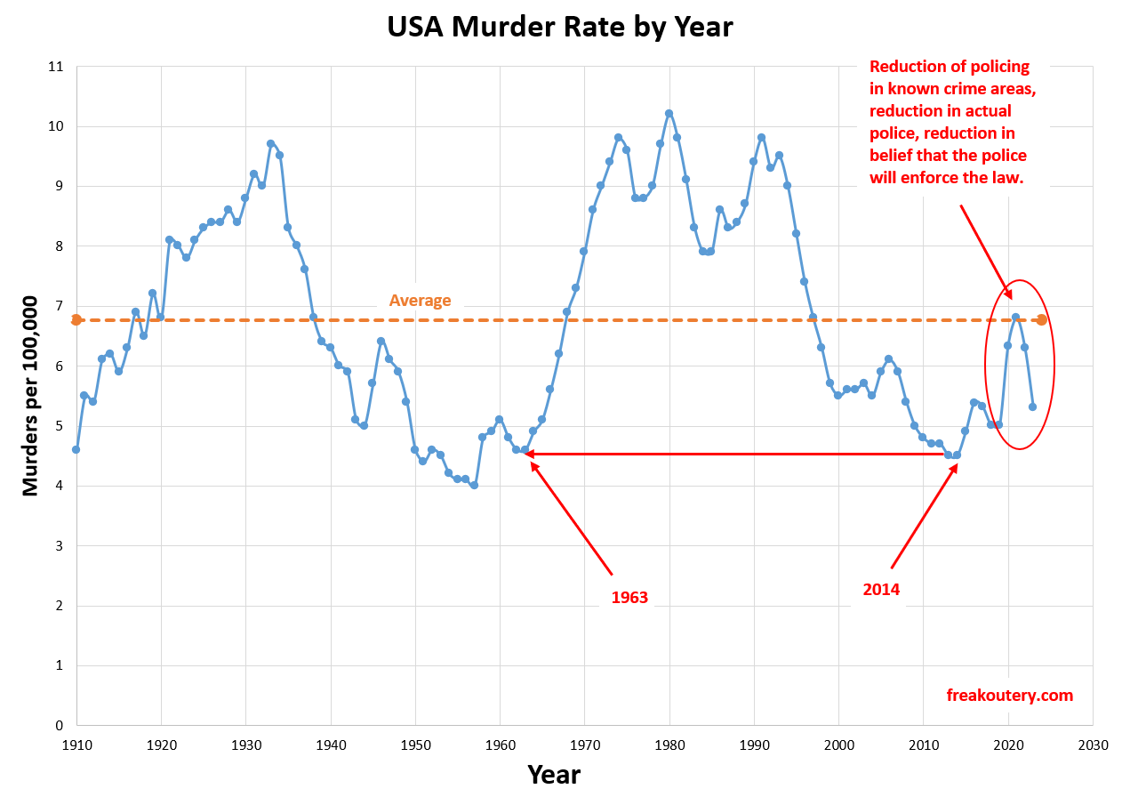 The United States crime wave of 2020 and 2021 is a golden example of this. Our religiosity quotient stayed relatively constant through those two years, but the willingness of the cops to police dangerous areas of town went down, the actual number of police went down, the trust in police went down, and the belief that the police were going to enforce anything went down, so crime went up. We lost on both axes through those two years, causing a murder spike, among other crimes.