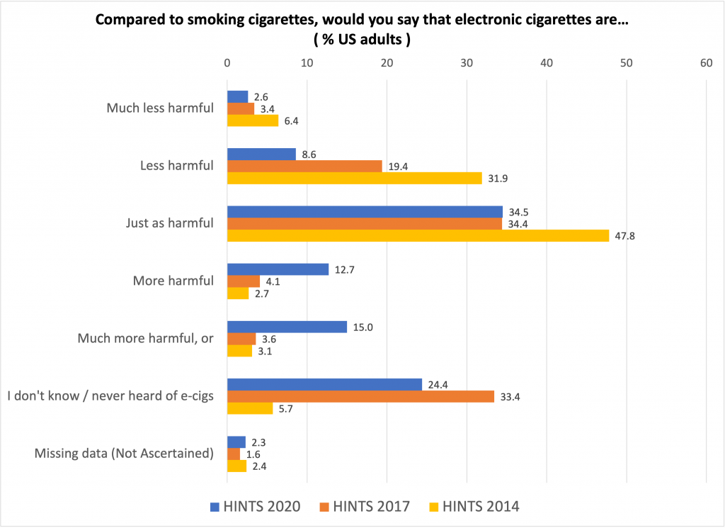 The US Cancer Institute HINTS survey indicates that only 2.6% of the United States population correctly understands that vapes are much less harmful than cigarettes, and further that the American public is becoming less informed about this fact over time: