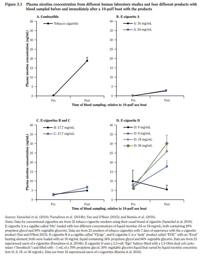 I know smokers who tried vaping and quit because it “didn’t hit right.” This is largely because over the counter vape solutions weren’t strong enough to simulate a cigarette, so they went back to cigarettes. If you want to transition to safer nicotine consumption, either on your way to quitting or simply to pursue a healthier (if not completely healthy) way to get your fix, I recommend starting by mixing your own unflavored vape juice from unflavored vegetable glycerin, and do it in concentrations that mirror a cigarette. The Surgeon General unwittingly provided a map for how to do this, in a document that was supposed to scare people away from vaping. Let’s look at his graphs.