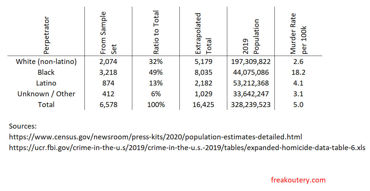 Table 6 has 6,578 homicides which fit the criteria for inclusion. If we presume the ratios exhibited in this table properly extrapolate to the total sample of 16,425 US murders in 2019 and do that extrapolation, this is what we get: