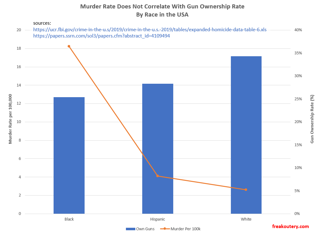 Further, we know that murder rate does not correlate in any way with gun ownership rate by race in the United States, because black folks own the fewest guns.