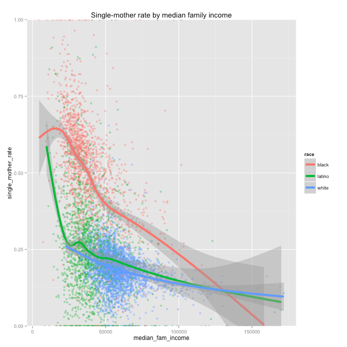 He goes on to note that single motherhood is higher in the black community than other communities, and is not predicted by income or other economic factors, even though the relationship between single motherhood and economics is very close for the white and Latino populations.