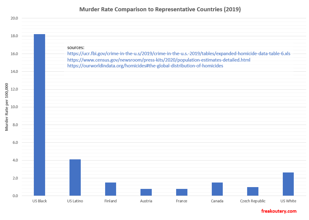It looks to me as if the chart I raked from Twitter is not accurate, but it’s similar. It seems that chart probably took homicide rates for other countries from the 1990s and rates for the USA from around 2014 as a way to cook the numbers. But the difference between the US white homicide rate and US black and Latino homicide rates is tremendously stark.