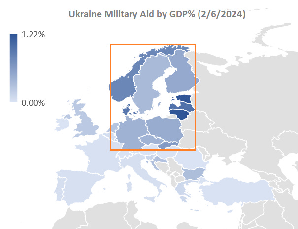 If you’re a European country inside the box of regional interest, you’re giving around 29 times more bullets to Ukraine than if you’re a European outside the box. And if you’re the USA or the United Kingdom, you’re already giving around 11 times more bullets to Ukraine than the European countries outside the box. Curiously, Canada (not shown) is giving over 5 times more bullets to Ukraine than the European countries outside the box.