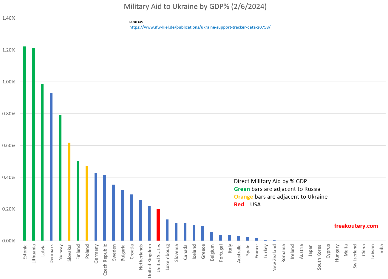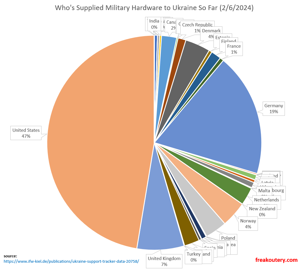 Let’s pretend you’re one of these English speaking people extracting social virtue by supporting Ukraine. Or perhaps you truly have a firm and inflexible moral stance on the Russian invasion and were out in the cold alone protesting when Russia invaded Georgia in 2008 and Crimea in 2014. Let’s pretend you also hate U.S. Republicans, which seems to be a running theme with these two groups, which is fine. If you want to at least be intellectually consistent with your anger, you should be angrier at the following countries than you are at Republicans for relative Ukrainian bullet supply: