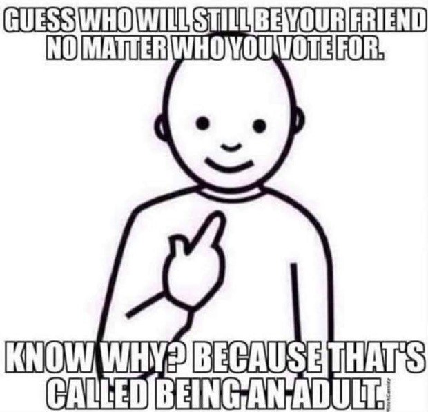 I do not believe that particular red myth is true. I just think most of the blues have been fed a very extreme set of lies and omissions about the entire Kenosha outburst from beginning to end, that the riots themselves were a product of “mostly good people” trying to make sense of this extreme set of lies, and that a second layer of lies was piled on the first about what happened during the Rittenhouse encounter to cover up the first layer. And that people are so invested in these lies that they can't recalibrate their opinions. I don't hate them for buying into these lies, because it's not their fault. I can remain their friend no matter who they vote for. I can act the meme, because acting the meme is far more adult than severing a friend relationship over their misunderstanding about an issue or situation.