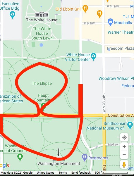 According to accounts on the ground, the overall attendance for the Trump rally during the 2021 electoral vote count totaled at least a quarter million people. Math here, based on the following images: