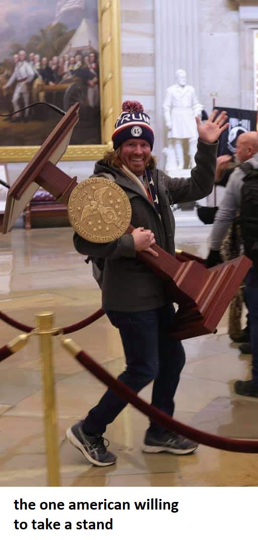 The only saving grace in our current situation, I think, is that people in the United States are too lazy and too fat and too old to run a competent revolution. It's way easier just to be an asshole on Facebook or Twitter and post memes, so that's what we do instead of murdering our neighbors. Instead of real revolution, we get these ghetto revolution LARPs where people blow off steam by throwing bottle rockets at the Portland federal building or stealing the senate podium and putting it on Ebay. And then take selfies.