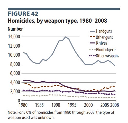 Let’s get back to data and unpack this homicide rate some. My top graph showing homicide rate over time is not broken down by firearm vs. nonfirearm, nor by firearm type. I wish I was able to obtain homicide-by-weapon-type data for the last century, but I wasn’t. If you know where I can find it, comment below please. But I was able to find the data for 1980 to 2008, or at least the presentation of it, in the US Department of Justice NCJ 236018. It’s a good read, with nice graphs. Figure 42 among them looks like this:
